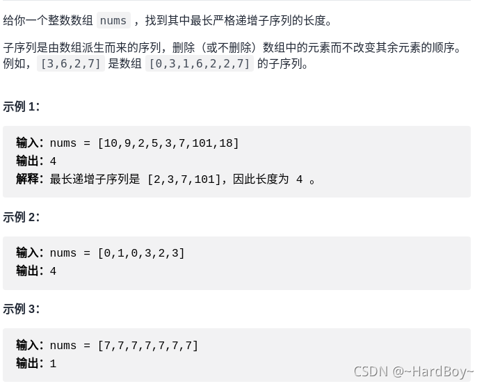 public:int lengthOfLIS(vector<int>& nums) {int n = nums.size();vector<int> dp(n, 1);int max_value = 1;for(int i = 1; i < n; i++){for(int j = 0; j < i; j++){if(nums[j] < nums[i]){dp[i] = max(dp[i], dp[j] + 1);max_value = max(dp[i], max_value);}}}return max_value;}