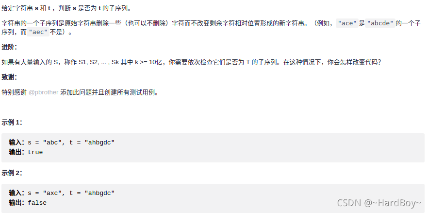 class Solution:def isSubsequence(self, s: str, t: str) -> bool:#双指针i, j = 0, 0while i < len(s) and j < len(t):if s[i] == t[j]:i += 1j += 1else:j += 1if i == len(s):return Trueelse:return False