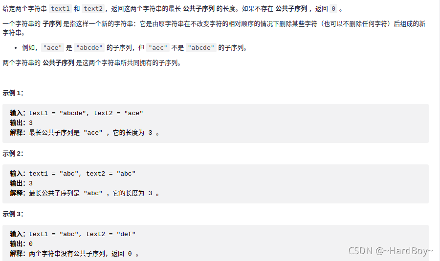 public:int longestCommonSubsequence(string text1, string text2) {int m = text1.size();int n = text2.size();vector<vector<int>> dp(m+1, vector<int>(n+1, 0));for(int i = 0; i < m; i++){for(int j = 0; j < n; j++){if(text1[i] == text2[j]){dp[i+1][j+1] = dp[i][j] + 1;}else{dp[i+1][j+1] = max(dp[i+1][j], dp[i][j+1]);}}}return dp[m][n];}