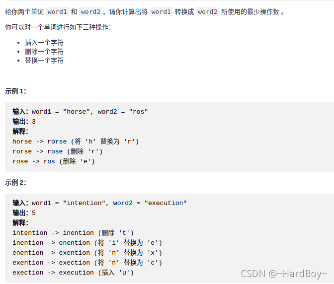 class Solution:def minDistance(self, word1: str, word2: str) -> int:m = len(word1)n = len(word2)dp = [[0 for i in range(n+1)] for i in range(m+1)]for i in range(1, m+1):dp[i][0] = ifor j in range(1, n+1):dp[0][j] = jfor i in range(m):for j in range(n):if word1[i] == word2[j]:dp[i+1][j+1] = dp[i][j]else:dp[i+1][j+1] = min(dp[i][j], dp[i+1][j], dp[i][j+1]) + 1return dp[m][n]