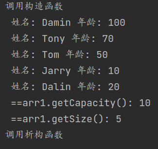 void test07(){MyArray<Person> arr(10);Person p1("Damin",100);Person p2("Tony",70);Person p3("Tom",50);Person p4("Jarry",10);Person p5("Dalin",20);arr.PushBack(p1);arr.PushBack(p2);arr.PushBack(p3);arr.PushBack(p4);arr.PushBack(p5);printPersonArray(arr);cout<<" ==arr1.getCapacity(): "<<arr.getCapacity()<<endl;cout<<" ==arr1.getSize(): "<<arr.getSize()<<endl;