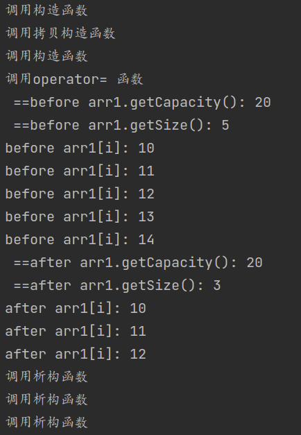 using namespace std;void test06(){MyArray<int> arr1(20);MyArray<int> arr2(arr1);MyArray<int> arr3(10);arr3 = arr1;for(int i=0; i<5; i++){arr1.PushBack(i + 10);}cout<<" ==before arr1.getCapacity(): "<<arr1.getCapacity()<<endl;cout<<" ==before arr1.getSize(): "<<arr1.getSize()<<endl;for(int i=0; i<arr1.getSize(); i++){cout<<"before arr1[i]: " <<arr1[i]<<endl;}arr1.PopBack();arr1.PopBack();cout<<" ==after arr1.getCapacity(): "<<arr1.getCapacity()<<endl;cout<<" ==after arr1.getSize(): "<<arr1.getSize()<<endl;for(int i=0; i<arr1.getSize(); i++){cout<<"after arr1[i]: " <<arr1[i]<<endl;}