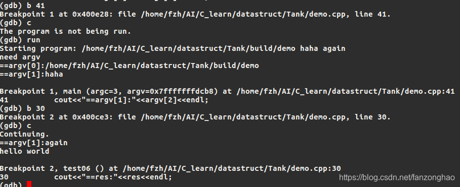 例如在41行设定断点后,run执行,在30行执行断点,c继续执行。