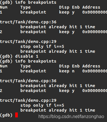 可看出 disable 1以后,就把该断点取消掉了(keep后面是n),跟delete还不一样。