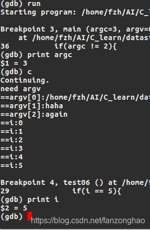 可看出添加b 29 if i==5时, 在i==5时就停了下来,按c继续执行完后面。