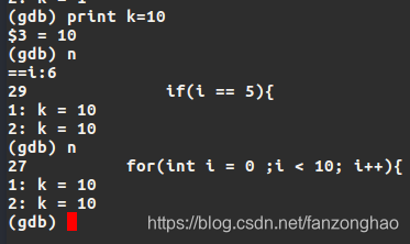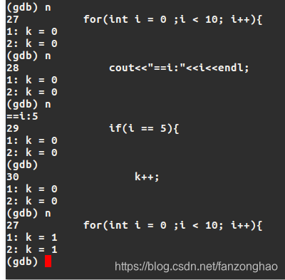 通过b 26设置断点,run以后,在display k,一步一步执行n就可以发现k的值变化了