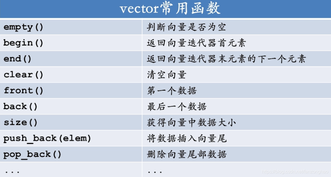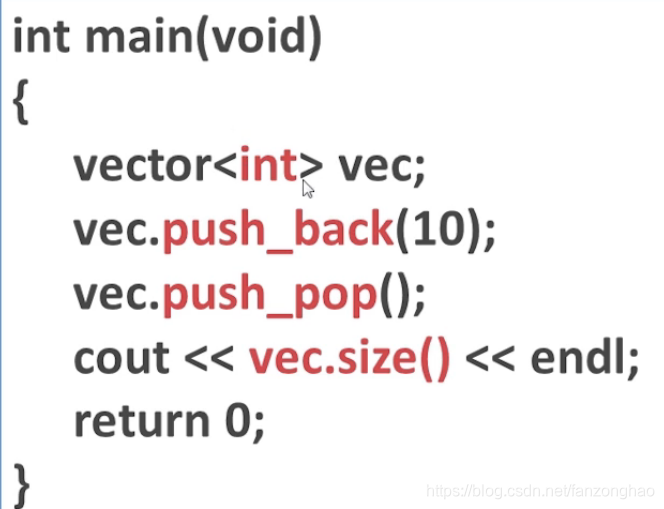 { vector <int> vec;vec.push_back(10);//尾部插入数据vec.push_back(4);//尾部插入数据vec.push_back(6);//尾部插入数据vec.push_back(3);//尾部插入数据cout<<"vec.size():"<<vec.size()<<endl;//打印长度vec.pop_back();//拿掉尾部数据 cout<<"vec.size():"<<vec.size()<<endl;//打印长度//一般遍历for (int i=0;i<vec.size();i++){cout<<"vec[i]:"<<vec[i]<<endl;}vector <int>::iterator itor = vec.begin();cout<<"*itor:"<<*itor<<endl;for (;itor!=vec.end();itor++){cout<<"*itor:"<<*itor<<endl;}cout<<"vec.front():"<<vec.front()<<endl;cout<<"vec.back():"<<vec.back()<<endl;return 0;