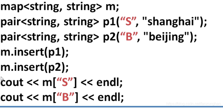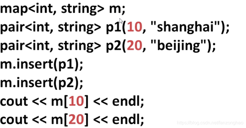 { map<int, string> m;pair<int, string> p1(3,"hello");pair<int, string> p2(6,"world");pair<int, string> p3(8,"beijing");m.insert(p1);m.insert(p2);m.insert(p3);cout<<m[3]<<endl;cout<<m[6]<<endl;map<int,string>::iterator itor = m.begin();for(;itor!=m.end();itor++){cout<<itor->first<<" "<<itor->second<<endl;}return 0;