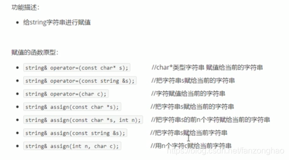 void test_01(){string str1;str1 = "hello";cout<<"===str1===:"<<str1<<endl;string str2;str2 = str1;cout<<"===str2===:"<<str2<<endl;string str3;str3 = 'a';cout<<"===str3===:"<<str3<<endl;string str4;str4.assign("hello c++"); //赋值全部字符串cout<<"===str4===:"<<str4<<endl;string str5;str5.assign("hello c++", 5); //赋值5个字符cout<<"===str5===:"<<str5<<endl;string str6;str6.assign(str5); //赋值5个字符cout<<"===str6===:"<<str6<<endl;string str7;str7.assign(10,'h'); //赋值5个字符cout<<"===str7===:"<<str7<<endl;