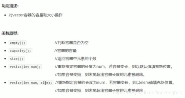 void test06(){vector<int> v;v.push_back(1);v.push_back(2);v.push_back(3);cout<<"===v.empty():==="<<v.empty()<<endl; //0 buweikong 1 weikongcout<<"===v.capacity():==="<<v.capacity()<<endl; //cout<<"===v.size():==="<<v.size()<<endl; // //default use 0 padv.resize(10);cout<<"==v[5]:"<<v[5]<<endl;cout<<"===v.capacity():==="<<v.capacity()<<endl; //cout<<"===v.size():==="<<v.size()<<endl; ////use 100 padv.resize(10, 100);cout<<"==v[5]:"<<v[5]<<endl;cout<<"===v.capacity():==="<<v.capacity()<<endl; //cout<<"===v.size():==="<<v.size()<<endl; //
