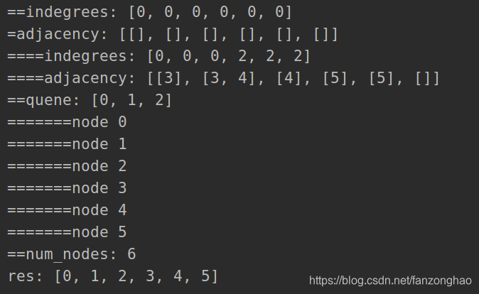 class Solution:def canFinish(self, numCourses, prerequisites):indegrees = [0] * numCourses  # 入度列表print('==indegrees:', indegrees)adjacency = [[] for i in range(numCourses)]  # 邻接列表print('=adjacency:', adjacency)#得到入度和每个课程的邻接列表for cur, pre in prerequisites:indegrees[cur] += 1adjacency[pre].append(cur)print('====indegrees:', indegrees)print('====adjacency:', adjacency)quene = []# 如果度为0 就进入队列for i in range(len(indegrees)):if indegrees[i] == 0:quene.append(i)print('==quene:', quene)num_nodes = 0learn_node = []while quene:node = quene.pop(0)print('=======node', node)learn_node.append(node)num_nodes += 1for next_node in adjacency[node]:indegrees[next_node] -= 1  # 找出下一个点相应的度-1if indegrees[next_node] == 0:  # 入度为0quene.append(next_node)print('==num_nodes:', num_nodes)return learn_node if num_nodes == numCourses else []# numCourses, prerequisites = 2, [[1, 0]]