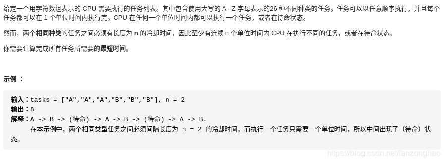 class Solution(object):def leastInterval(self, tasks, n):""":type tasks: List[str]:type n: int:rtype: int"""length = len(tasks)if length <= 1:return lengthprint('===length:', length)# 用于记录每个任务出现的次数task_dict = {}for task in tasks:#不存在task时 返回0task_dict[task] = task_dict.get(task,0)+1print('==task_dict:', task_dict)# 按任务出现的次数从大到小排序task_sort = sorted(task_dict.items(), key=lambda x: x[1], reverse=True)print('==task_sort:', task_sort)# # 出现最多次任务的次数max_task_count = task_sort[0][1]# 至少需要的最短时间res = (max_task_count - 1) * (n + 1)for sort in task_sort:if sort[1] == max_task_count:res += 1print('==res:', res)# # 如果结果比任务数量少,则返回总任务数return res if res >= length else lengthtasks = ["A","A","A","B","B","B"]