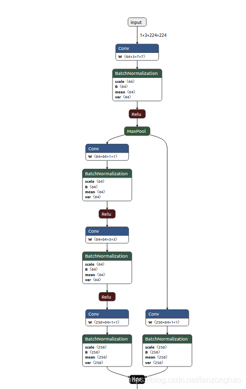 {Weights emptywts{ DataType::kFLOAT, nullptr, 0};//实例化一个空weights emptywts 空指针 长度为0IConvolutionLayer* conv1 = network->addConvolutionNd(input, outch, DimsHW{1,1}, weightMap[lname+".conv1.weight"], emptywts);assert(conv1);conv1->setStrideNd(DimsHW{stride, stride});IScaleLayer* bn1 = addBatchNorm2d(network, weightMap, *conv1->getOutput(0), lname+".bn1", 1e-5);assert(bn1);IActivationLayer* relu1 = network->addActivation(*bn1->getOutput(0), ActivationType::kRELU);assert(relu1);IConvolutionLayer* conv2 = network->addConvolutionNd(*relu1->getOutput(0), outch, DimsHW{3,3}, weightMap[lname+".conv2.weight"], emptywts);assert(conv2);conv2->setStrideNd(DimsHW{stride, stride});conv2->setPaddingNd(DimsHW{1, 1});IScaleLayer* bn2 = addBatchNorm2d(network, weightMap, *conv2->getOutput(0), lname+".bn2", 1e-5);assert(bn2);IActivationLayer* relu2 = network->addActivation(*bn2->getOutput(0), ActivationType::kRELU);assert(relu2);IConvolutionLayer* conv3 = network->addConvolutionNd(*relu2->getOutput(0), inch, DimsHW{1,1}, weightMap[lname+".conv3.weight"], emptywts);assert(conv3);conv3->setStrideNd(DimsHW{stride, stride});IScaleLayer* bn3 = addBatchNorm2d(network, weightMap, *conv3->getOutput(0), lname+".bn3", 1e-5);assert(bn3);IElementWiseLayer* ew1 = network->addElementWise(input, *bn3->getOutput(0), ElementWiseOperation::kSUM);assert(ew1);IActivationLayer* relu3 = network->addActivation(*ew1->getOutput(0), ActivationType::kRELU);assert(relu3);return relu3;