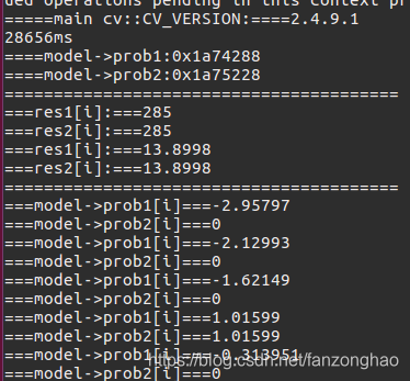 } int main(int argc, char** argv){if( argc != 2){cout<<"图片路径没有输入"<<endl;return -1;}ResNet50* model = new ResNet50();//开始推理, 模拟推理10000次,存储推理结果const char* enginePath = "./resnet50.engine";model->InferenceInit(enginePath);//将引擎文件载入显卡,反序列化好环境并启动cuda核const char* imgPath = argv[1];cout<<"=====main cv::CV_VERSION:===="<<CV_VERSION<<endl;auto start = chrono::system_clock::now();//开始时间model->preProcess(imgPath);//图像预处理 for (int i = 0; i < model->INFER_NUMS; i++){ // std::cout<<"data[i]:"<<data[i]<<std::endl;model->doInference(model->data, model->prob1, model->prob2, model->batchSize); //开始推理}auto end = chrono::system_clock::now();//结束时间std::cout << chrono::duration_cast<chrono::milliseconds>(end - start).count() << "ms" << std::endl;cout<<"====model->prob1:"<<model->prob1<<endl;//打印地址cout<<"====model->prob2:"<<model->prob2<<endl;//打印地址cout<<"========================================"<<endl; vector<float>res1(2, 0);get_index_value(model->OUTPUT_SIZE, model->prob1, res1);vector<float>res2(2, 0);get_index_value(model->OUTPUT_SIZE, model->prob2, res2);for(int i=0; i<2; i++){cout<<"===res1[i]:==="<<res1[i]<<endl;//打印最大值的索引cout<<"===res2[i]:==="<<res2[i]<<endl;//打印最大值}cout<<"========================================"<<endl;ofstream trt_result("./fc_and_relu.txt");int topk = 100;for (int i = 0; i < topk; i++){ trt_result<<model->prob1[i];trt_result<<",";trt_result<<model->prob2[i]<<endl;cout<<"===model->prob1[i]==="<<model->prob1[i]<<endl;cout<<"===model->prob2[i]==="<<model->prob2[i]<<endl;} trt_result.close();// vector<float> ProbIndex(model->prob1, model->prob1 + model->OUTPUT_SIZE);// vector<int> sorted_indx;// vector<int> res;// sorted_indx = sort_indexes(ProbIndex, true);// vector<float> ProbIndex1(model->prob1, model->prob1 + model->OUTPUT_SIZE);// vector<float> ProbIndex2(model->prob2, model->prob2 + model->OUTPUT_SIZE);// vector<int> sorted_indx1;// vector<int> sorted_indx2;// sorted_indx1 = topk_index(model->OUTPUT_SIZE, model->prob1, ProbIndex1);// sorted_indx2 = topk_index(model->OUTPUT_SIZE, model->prob2, ProbIndex2);// for (int i = 0; i < topk; i++)// { // cout<<"===sorted_indx1[i]==="<<sorted_indx1[i]<<endl;// cout<<"===sorted_indx2[i]==="<<sorted_indx2[i]<<endl;// } delete model;model = nullptr;return 0;