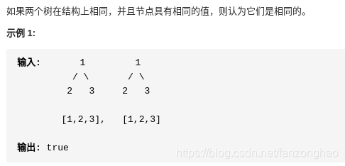 public:bool isSameTree(TreeNode* p, TreeNode* q) {if(p==nullptr && q==nullptr){return true;}if(p==nullptr || q==nullptr){return false;}if(p->val != q->val){return false;}return isSameTree(p->left,q->left) && isSameTree(p->right,q->right);}