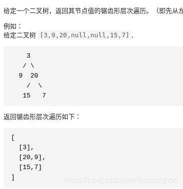 #         self.right = Noneclass Solution:def help(self,node,level):if node:if len(self.res) == level:self.res.append([])self.res[level].append(node.val)self.help(node.left,level+1)self.help(node.right,level+1)def zigzagLevelOrder(self, root: TreeNode) -> List[List[int]]:self.res = []if root is None:return self.resself.help(root, 0)for i in range(len(self.res)):if i%2==1:self.res[i] = self.res[i][::-1]return self.res2.迭代解法