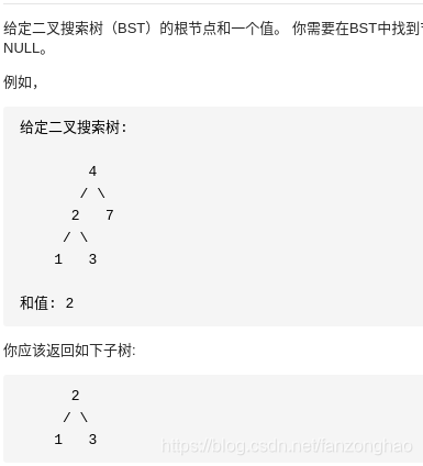 public:TreeNode* searchBST(TreeNode* root, int val) {if(root == nullptr){return root;}if(root->val == val){return root;}if(root->val > val){return searchBST(root->left,val);}else{return searchBST(root->right,val);}}