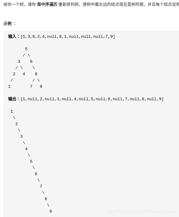 #         self.right = Noneclass Solution:def increasingBST(self, root: TreeNode) -> TreeNode:res= []if root is None:return resdef helper(node):if node:helper(node.left)res.append(node.val)helper(node.right)helper(root)print('res:', res)#构建树new_node = TreeNode(res[0])current_node=new_nodefor i in range(len(res)-1):current_node.left = Nonecurrent_node.right = TreeNode(res[i+1])current_node = current_node.rightreturn new_nodec++实现: