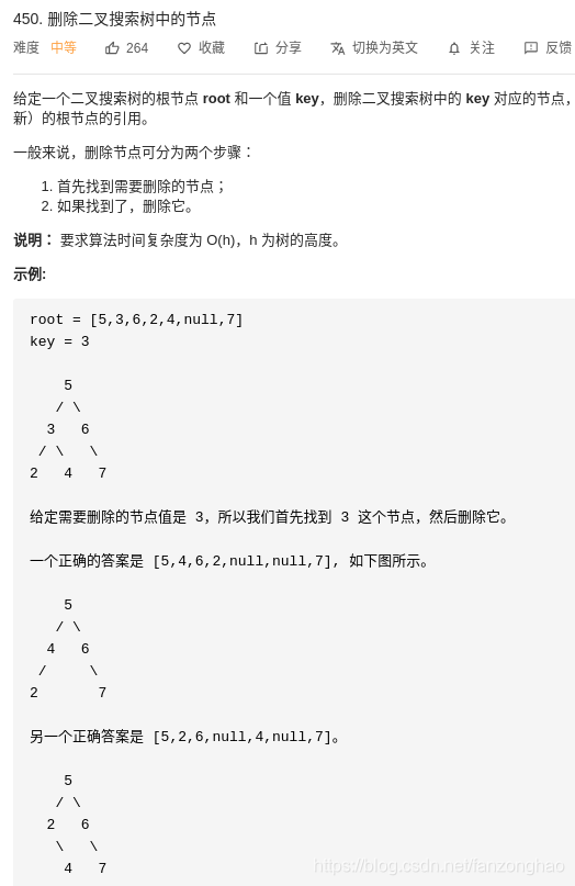 public:int get_succesor(TreeNode* node){//得到后继节点node = node->right;while(node->left != nullptr){node = node->left;}return node->val;}int get_pressor(TreeNode* node){node = node->left;while(node->right != nullptr){node = node->right;}return node->val;}TreeNode* deleteNode(TreeNode* root, int key) {if(root == nullptr){return nullptr;}if(root->val < key){root->right= deleteNode(root->right, key);}else if(root->val >key){root->left= deleteNode(root->left, key);}else{if(root->left == nullptr && root->right == nullptr){root = nullptr;}else if(root->right != nullptr){root->val = get_succesor(root);root->right = deleteNode(root->right, root->val);}else{root->val = get_pressor(root);root->left = deleteNode(root->left, root->val);}}return root;}