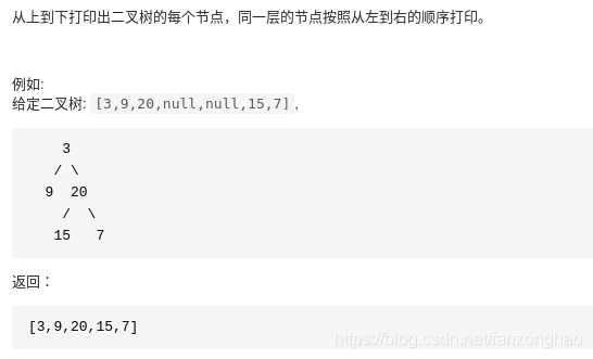 public:vector<int> levelOrder(TreeNode* root) {vector<int>res;if(!root){return {};}queue<TreeNode*> queue_A;queue_A.push(root);while(!queue_A.empty()){TreeNode* node = queue_A.front();res.push_back(node->val);queue_A.pop();if(node->left){queue_A.push(node->left);}if(node->right){queue_A.push(node->right);}}return res;}