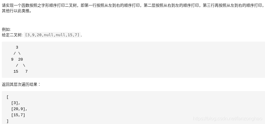 public:vector<vector<int>> levelOrder(TreeNode* root) {vector<vector <int>> res;if (root==NULL){return {};}queue<TreeNode* > queue_A;queue_A.push(root);while(!queue_A.empty()){vector <int> temp_res;int count = queue_A.size();for (int i=0;i<count;i++){TreeNode* node =  queue_A.front();                temp_res.push_back(node->val);queue_A.pop();if(node->left){queue_A.push(node->left);}if(node->right){queue_A.push(node->right);}}if(res.size()%2==0){res.push_back(temp_res);}else{reverse(temp_res.begin(),temp_res.end());res.push_back(temp_res);}            }return res;}