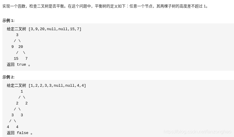 class Solution:def depth(self, node):if node is None:return 0return max(self.depth(node.left), self.depth(node.right)) + 1def isBalanced(self, root: TreeNode) -> bool:if root is None:return Trueif abs(self.depth(root.left) - self.depth(root.right)) > 1:return Falsereturn self.isBalanced(root.left) and self.isBalanced(root.right)c++实现: