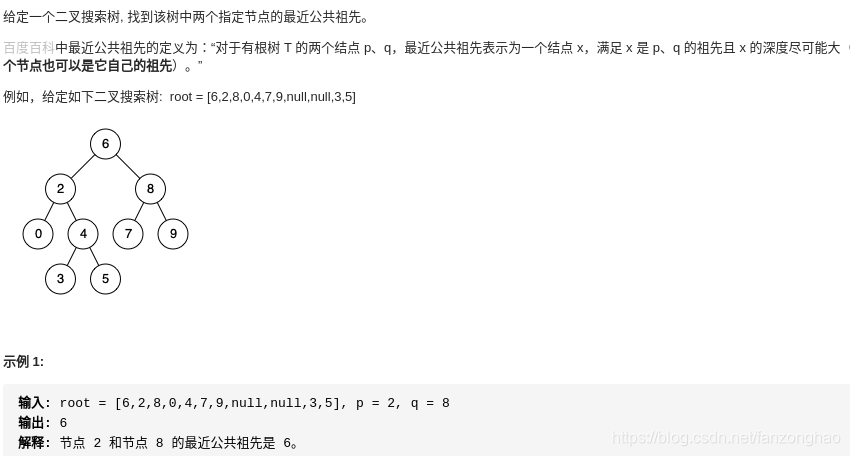 #         self.right = Noneclass Solution:def lowestCommonAncestor(self, root: 'TreeNode', p: 'TreeNode', q: 'TreeNode') -> 'TreeNode':if root==p or root==q or root is None:return rootleft_node = self.lowestCommonAncestor(root.left,p,q)right_node = self.lowestCommonAncestor(root.right,p,q)if left_node is None:return right_nodeif right_node is None:return left_nodereturn root解法2利用二叉搜索树特点根节点值和左右子树值大小的特点.递归法