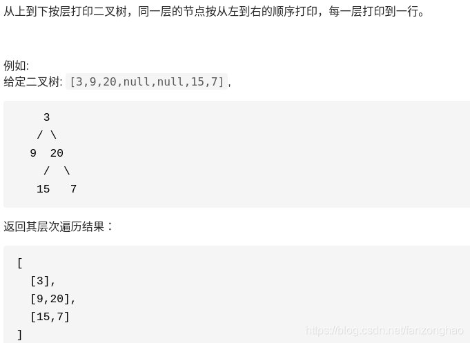 public:vector<vector<int>> levelOrder(TreeNode* root) {vector<vector<int>> res;        if(!root){return {};}queue<TreeNode* > queue_A;queue_A.push(root);while(!queue_A.empty()){ vector<int> temp_res;int count = queue_A.size();for (int i=0;i<count;i++){                TreeNode* node = queue_A.front();temp_res.push_back(node->val);queue_A.pop();if(node->left){queue_A.push(node->left);}if(node->right){queue_A.push(node->right);}}res.push_back(temp_res);            }return res;}};