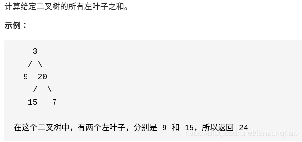 public:int res;void help(TreeNode* node){if(node == NULL){return ;}if(node->left !=NULL && node->left->left ==NULL && node->left->right ==NULL){res+=node->left->val;}help(node->left);help(node->right);}int sumOfLeftLeaves(TreeNode* root) {if(root == NULL){return 0;}help(root);return res;}