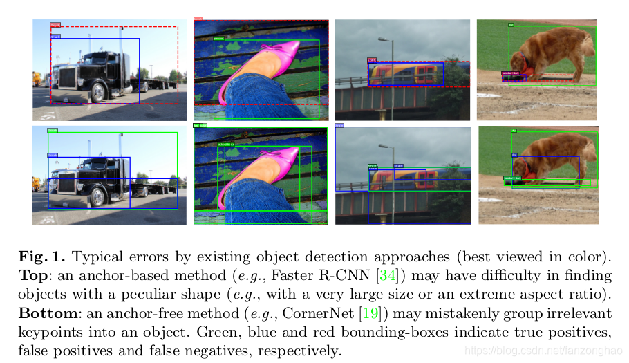 anchor-based方法将大量框密集分布在feature map上,在推理时,由于预设的anchor与目标差异大,召回率会偏低。而anchor-free不受anchor大小限制,在任意形状上会更加灵活,但是像CornerNet这种,先进行角点检测,将有效的角点枚举组合成大量候选预测框,容易带来大量的FP。而FCOS需要回归关键点到边界的距离,对于长宽大的物体也比较难以预测。