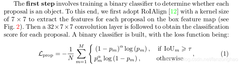 首先在feature map上选用7*7RoIAlign提取每个候选框的特征,在使用1个32*7*7输出二分类的分类score。