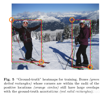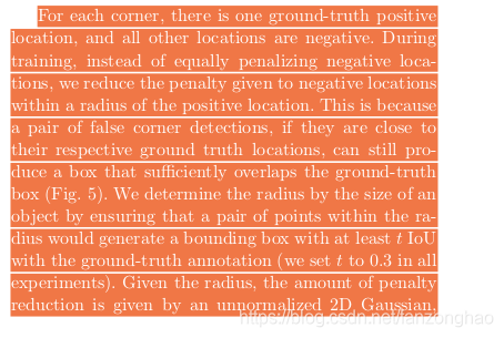 对于角点半径周围与gt box的IOU为0.3的box的负样本,没必要完全贡献loss,因为角点附近的负样本构成的box也能挺好覆盖目标.对于处于框内的角点,loss按照高斯分布来进行分配.