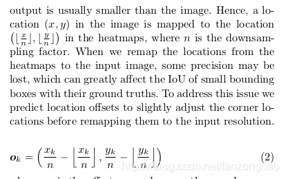 x,y是原图坐标,n是下采样倍数, 这里从预测图的heatmap恢复到原图就会有精度损失,严重影响小物体,所以采用offsets进行修正.