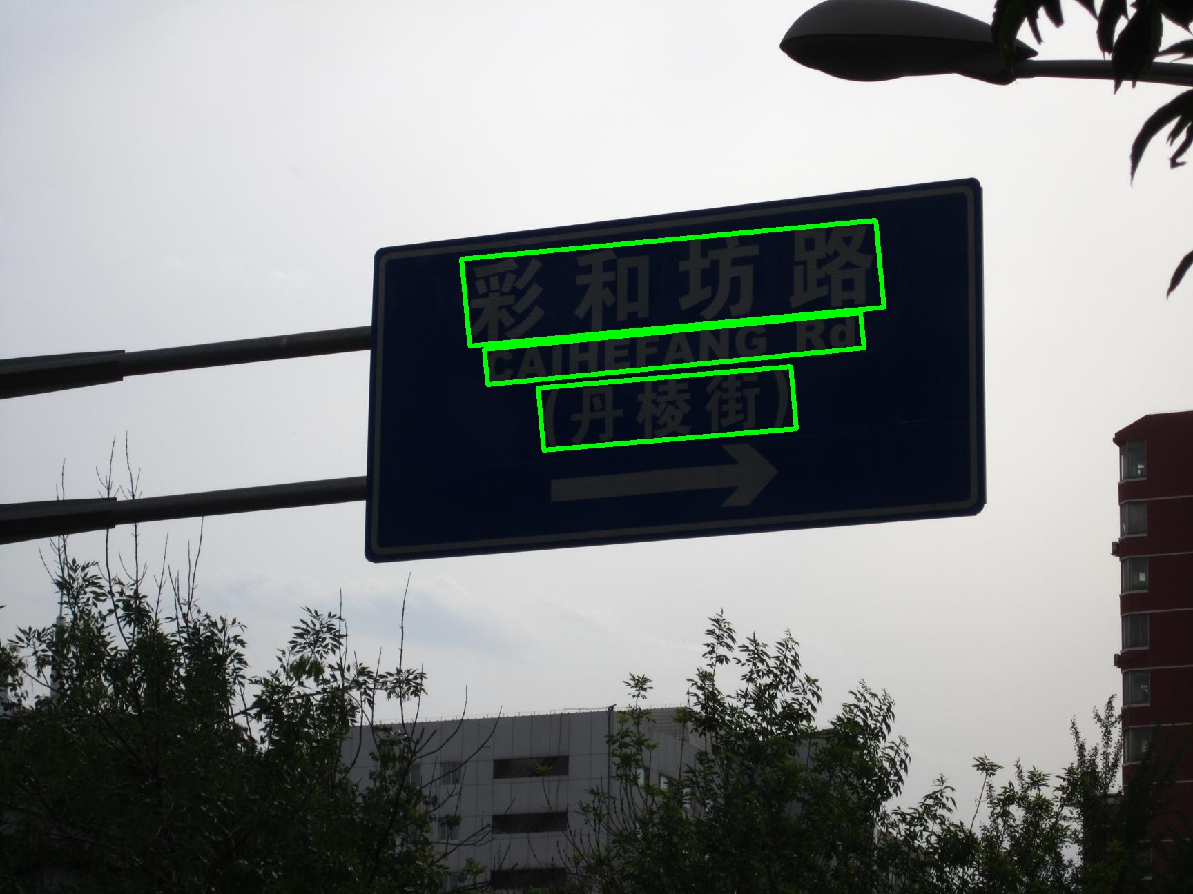 def read_val():"""将make_standard_txt函数制作的polygon进行验证:return:"""txt_path = './train/IMG_0723.txt'img_path = txt_path.replace('.txt', '.JPG')img = cv2.imread(img_path)print('img.shape:', img.shape)with open(txt_path, 'r', encoding='utf-8') as rfile:for j,read_info in enumerate(rfile):# if j<1:print('read_info:', read_info)point = list(map(int, read_info.strip().split(',')[:-1]))print('point:', point)#需要变成顺时针才用cv2.polylines显示point = [point[0], point[1], point[-2],point[-1], point[4], point[5], point[2], point[3]]cv2.polylines(img, [np.array(point).reshape(-1, 1, 2)], True, (0, 255, 0), thickness=5)cv2.imwrite('img.jpg', img)