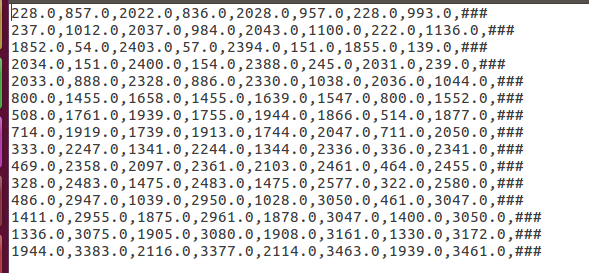 def lableme_json_txt():path ='./效果差的_去章'imgs_list_path = [os.path.join(path, i) for i in os.listdir(path) if '.jpg' in i]print('==len(imgs_list_path)', len(imgs_list_path))for i, img_list_path in enumerate(imgs_list_path):# if i<1:json_list_path = img_list_path.replace('.jpg', '.json')output_txt_path = img_list_path.replace('.jpg', '.txt')with open(json_list_path, 'r') as file:json_info = json.load(file)print('===json_info', json_info)shapes = json_info['shapes']output_points = []for shape in shapes:points = np.array(shape['points']).astype(np.int)points = cal_stand_points(points)print('===points', points)output_points.append(list(map(str, (points.reshape(-1).tolist()))))print('===output_points', output_points)with open(output_txt_path, 'w', encoding='utf-8') as file:[file.write(','.join(out) + ',###\n') for out in output_points]if __name__ == '__main__':lableme_json_txt()