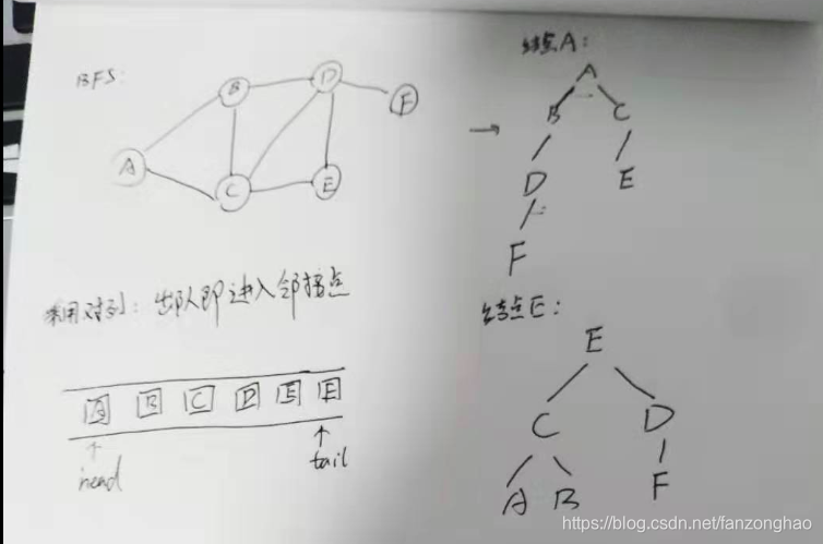 graph ={'A':['B', 'C'],'B':['C', 'D'],'C':['B','E'],'D':['B','E','F'],'E':['C','D'],'F':['D']}def BFS(graph,node):quene = []quene.append(node)seen = set()seen.add(node)res = []while len(quene):verix = quene.pop(0)nodes = graph[verix]for node_ in nodes:if node_ not in seen:quene.append(node_)seen.add(node_)# print('==verix:', verix)res.append(verix)return resres = BFS(graph, node='A')