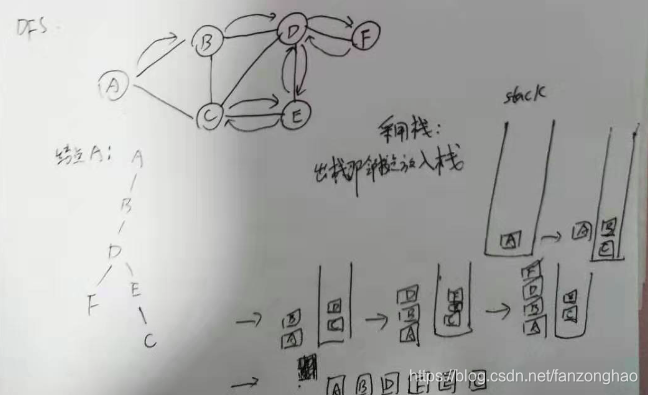 graph ={'A':['B', 'C'],'B':['C', 'D'],'C':['B','E'],'D':['B','E','F'],'E':['C','D'],'F':['D']}def DFS(graph,node):stack = []stack.append(node)seen = set()seen.add(node)res = []while len(stack):verix = stack.pop()nodes = graph[verix]for node_ in nodes:if node_ not in seen:stack.append(node_)seen.add(node_)# print('==verix:', verix)res.append(verix)return resres = DFS(graph, node='A')