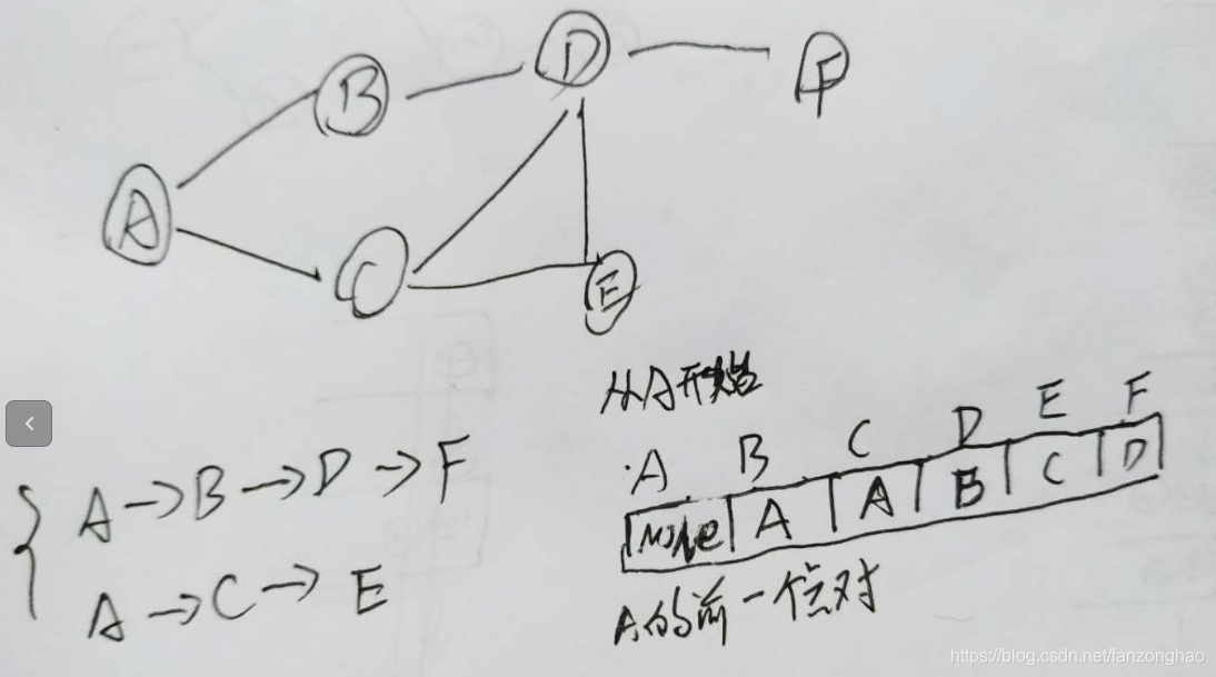 graph ={'A':['B', 'C'],'B':['C', 'D'],'C':['B','E'],'D':['B','E','F'],'E':['C','D'],'F':['D']}#延展求节点和节点之间的最短路径, 通过构建节点的前一个节点 成对,