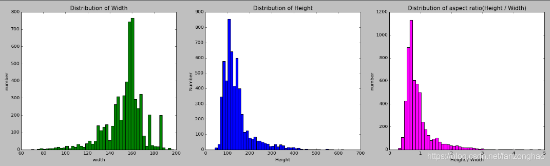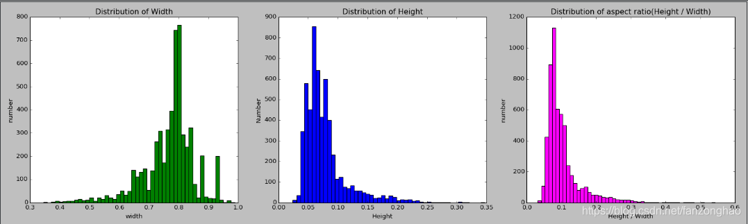 BBOX_NORMALIZE = Truedef show_cluster(data, cluster, max_points=2000):'''Display bouding box's size distribution and anchor generated in scatter.'''if len(data) > max_points:idx = np.random.choice(len(data), max_points)data = data[idx]plt.scatter(data[:, 0], data[:, 1], s=5, c='lavender')plt.scatter(cluster[:, 0], cluster[:, 1], c='red', s=100, marker="^")plt.xlabel("Width")plt.ylabel("Height")plt.title("Bounding and anchor distribution")plt.savefig("cluster.png")plt.show()def show_width_height(data, cluster, bins=50):'''Display bouding box distribution with histgram.'''if data.dtype != np.float32:data = data.astype(np.float32)width = data[:, 0]height = data[:, 1]ratio = height / widthplt.figure(1, figsize=(20, 6))plt.subplot(131)plt.hist(width, bins=bins, color='green')plt.xlabel('width')plt.ylabel('number')plt.title('Distribution of Width')plt.subplot(132)plt.hist(height, bins=bins, color='blue')plt.xlabel('Height')plt.ylabel('Number')plt.title('Distribution of Height')plt.subplot(133)plt.hist(ratio, bins=bins, color='magenta')plt.xlabel('Height / Width')plt.ylabel('number')plt.title('Distribution of aspect ratio(Height / Width)')plt.savefig("shape-distribution.png")plt.show()def sort_cluster(cluster):'''Sort the cluster to with area small to big.'''if cluster.dtype != np.float32:cluster = cluster.astype(np.float32)area = cluster[:, 0] * cluster[:, 1]cluster = cluster[area.argsort()]ratio = cluster[:, 1:2] / cluster[:, 0:1]return np.concatenate([cluster, ratio], axis=-1)# def load_dataset(path, normalized=True):