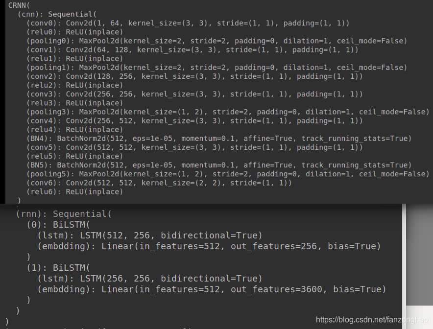 def crnn_test():print('===================CRNN===========================')model = CRNN(32, 1, 3600, 256)print(model)x = torch.rand((32, 1, 32, 200)) # b c h wprint('input:', x.size())out = model(x)print(out.size())