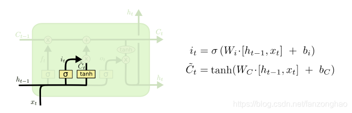更新层,这里要注意的是用了tanh,值域在-1,1,起到信息加强和减弱的作用.