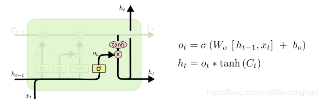 输出层,上述两层的信息相加流通到这里以后,经过tanh函数得到输出值候选项,而候选项中的哪些部分最终会被输出由一个sigmoid层来决定.这时就得到了输出状态和输出值,下一时刻也是如此.