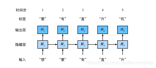 下图是一个循环神经网络实现语言模型的示例,可以看出其是基于当前的输入与过去的输入序列,预测序列的下一个字符.
