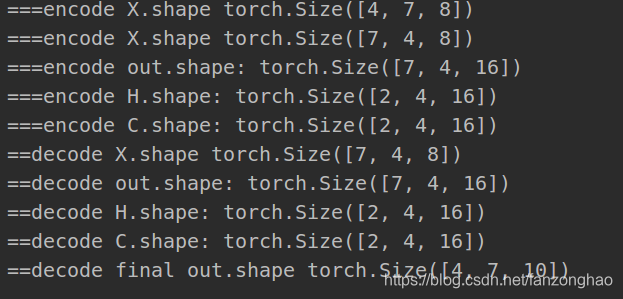 class Seq2SeqEncoder(d2l.Encoder):def __init__(self, vocab_size, embed_size, num_hiddens, num_layers,dropout=0, **kwargs):super(Seq2SeqEncoder, self).__init__(**kwargs)self.num_hiddens = num_hiddensself.num_layers = num_layersself.embedding = nn.Embedding(vocab_size, embed_size)#每个字符编码成一个向量self.rnn = nn.LSTM(embed_size, num_hiddens, num_layers, dropout=dropout, batch_first=False)def begin_state(self, batch_size, device):#(H, C)return [torch.zeros(size=(self.num_layers, batch_size, self.num_hiddens), device=device),torch.zeros(size=(self.num_layers, batch_size, self.num_hiddens), device=device)]def forward(self, X, *args):X = self.embedding(X) # X shape: (batch_size, seq_len, embed_size)print('===encode X.shape', X.shape)X = X.transpose(0, 1) # (seq_len, batch_size, embed_size)print('===encode X.shape', X.shape)state = self.begin_state(X.shape[1], device=X.device)out, state = self.rnn(X,state)print('===encode out.shape:', out.shape)#(seq_len, batch_size, num_hiddens)H, C = stateprint('===encode H.shape:', H.shape)#(num_layers, batch_size, num_hiddens)print('===encode C.shape:', C.shape)#(num_layers, batch_size, num_hiddens)return out, state#双层lstm将encode层隐藏层信息解码出来
