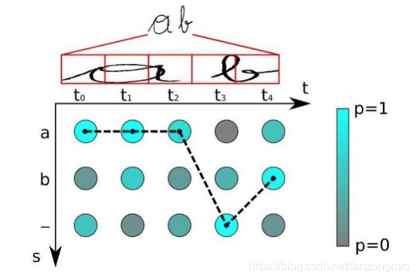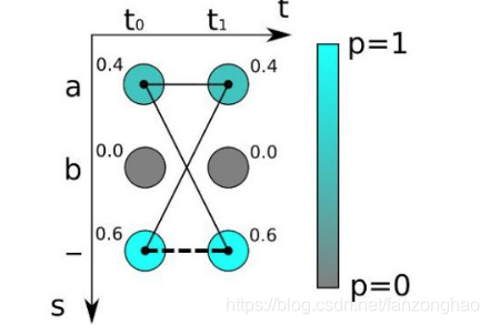其中t0,t1代表两个时间步长,黑色线代表a字符的路径,虚线代表空文本路径。