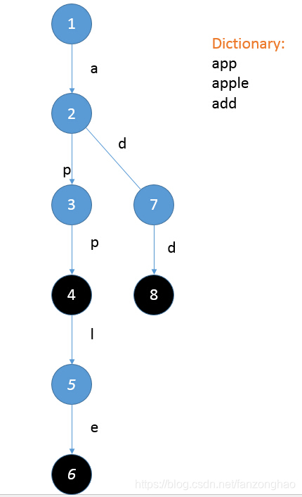 例如三个单词app, apple, add,我们按照以下规则创建了一颗Trie树.对于从树的根结点走到黑色结点的路径上的字母依次组合起来就是一个完整的单词.