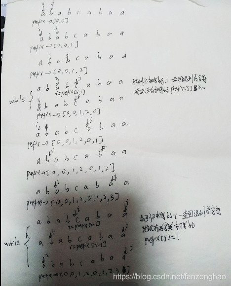 def pefix_table(pattern):"""字符串最长公共前后缀思路:通过遍历字符串来寻找公共部分,当出现不一样的时候 需要回退直到比较首字符"""""" 'ababcabaa' """# """ 'ababa' """# 'aa'i = 0prefix = [0]*len(pattern)for j in range(1, len(pattern)):while(pattern[j]!=pattern[i] and i>0):#循环判断如果发现没有相等就一直回退直到i==0也就是首字符i = prefix[i-1]if pattern[j] == pattern[i]:#相等的話就记录相等的长度i += 1prefix[j] = ielse:prefix[j] = 0#不相等的話就长度长公共前后缀记录为0return prefixdef move_prefix(prefix):""""""real_prefix = [-1]*len(prefix)for i in range(len(prefix)-1):real_prefix[i+1]=prefix[i]return real_prefix# str_ = 'ababcabaa'