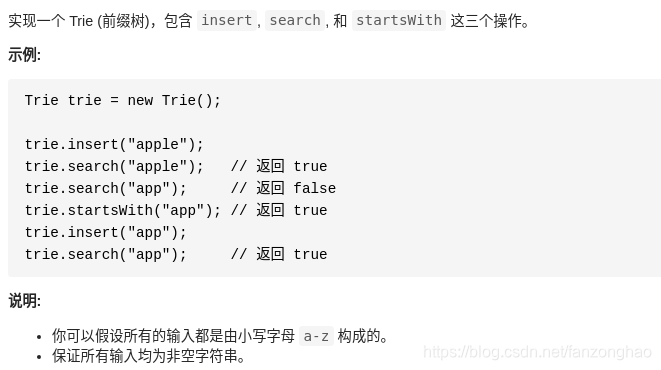 class Trie:def __init__(self):"""Initialize your data structure here."""self.root = {}self.word_end = -1def insert(self, word):"""Inserts a word into the trie."""curNode = self.rootfor c in word:# print('==self.root:', self.root)if c not in curNode:curNode[c] = {}curNode = curNode[c]curNode[self.word_end] = Truedef search(self, word):"""Returns if the word is in the trie."""curNode = self.rootfor c in word:if c not in curNode:return FalsecurNode = curNode[c]# Doesn't end hereif self.word_end not in curNode:return Falsereturn Truedef startsWith(self, prefix):"""Returns if there is any word in the trie that starts with the given prefix."""curNode = self.rootfor c in prefix:if c not in curNode:return FalsecurNode = curNode[c]return Trueword = 'apple'