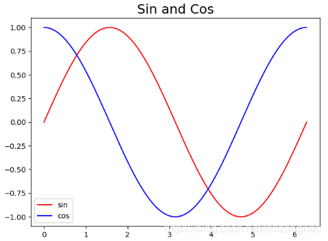 def show(sin_np,cos_np):plt.figure()plt.title('Sin and Cos', fontsize='18')plt.plot(steps, sin_np, 'r-', label='sin')plt.plot(steps, cos_np, 'b-', label='cos')plt.legend(loc='best')plt.show()