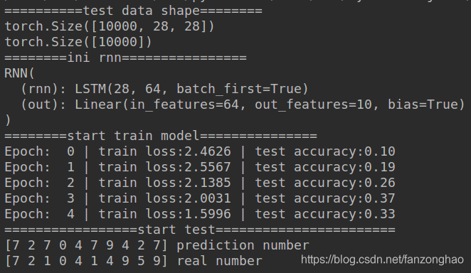 for epoch in range(epochs):for step, (x, y) in enumerate(train_loader):if step < 10:# print(x.size())#[batch,28,28]input = Variable(x.squeeze())#[batch]label = Variable(y)# print('============train data input shape=========')# print(input.size())# print(label.size())output = rnn(input)loss = loss_func(output, label)optimizer.zero_grad()loss.backward()optimizer.step()else:breaktest_output = rnn(test_x.squeeze())# print(test_output.size())pred_y = torch.max(test_output, 1)[1].data.numpy().squeeze()# print(pred_y.shape)accuracy = sum(pred_y == test_y.numpy()) / float(test_y.size(0))print('Epoch: ', epoch, '| train loss:%.4f' % loss.item(), '| test accuracy:%.2f' % accuracy)print('=================start test=======================')